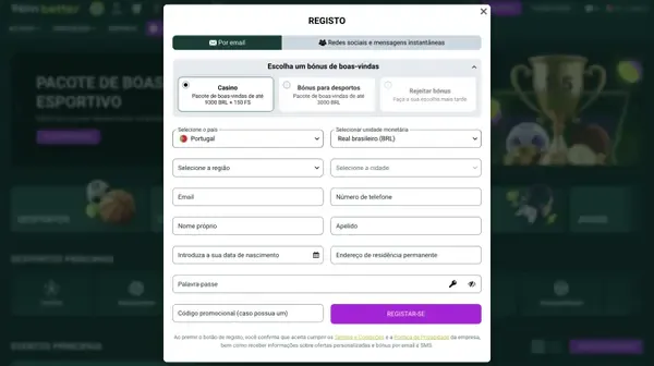 Registo e criação de conta na Spinbetter